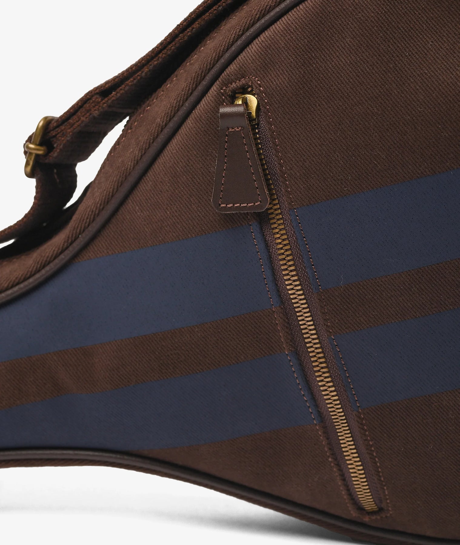 The Padel racket bag from the FW25 collection reinterprets sporty elegance in a contemporary key. Made of chocolate-brown "peach skink" cotton, it is decorated with double blue bands that recall the college spirit in a decisive and original way.