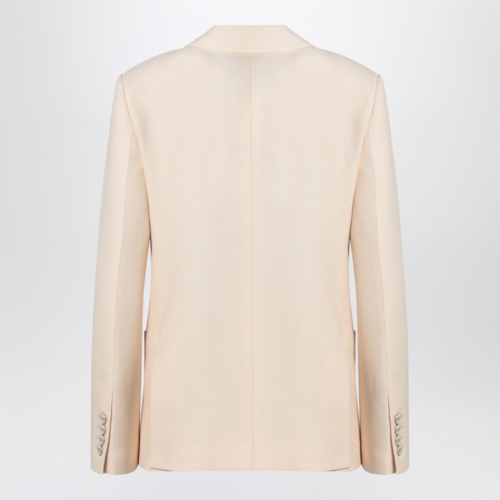 Single-breasted jacket by Valentino in light beige virgin wool and silk, characterized by a front closure with logoed buttons, three applied pockets on the front, long sleeves with buttoned cuffs, and a double rear vent. Size and Fit - Model wears size 38 IT Model measurements: Height: 180 cm Chest: 85 cm Waist: 66 cm Hips: 89 cm
